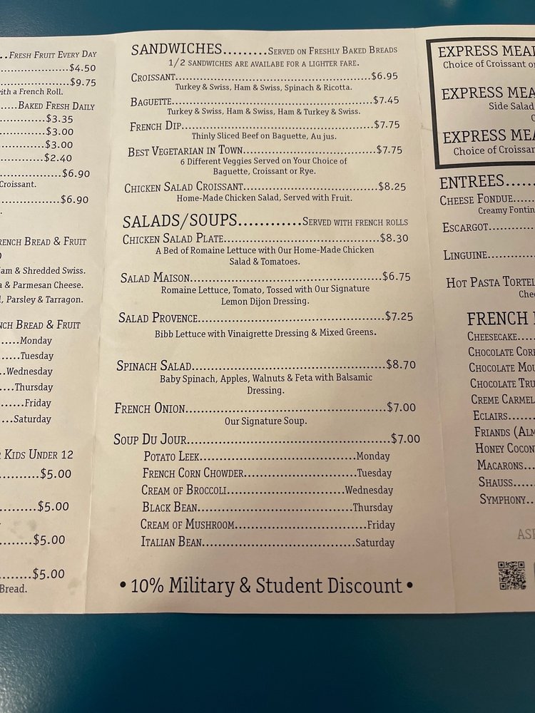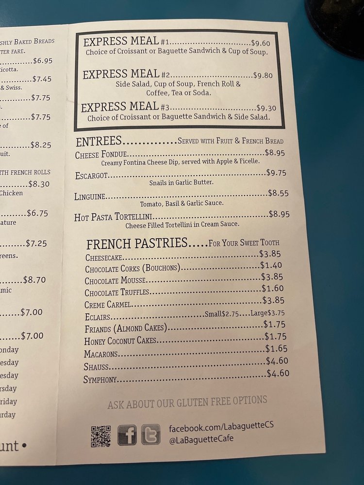 Introducing La Baguette, located in Colorado Springs, a charming French bistro offering a range of breakfast and brunch options. With a focus on fresh and homemade ingredients, La Baguette caters to a diverse crowd with options like fruit plates, croissants, omelettes, and salads. The cozy atmosphere adorned with local art and friendly staff create a welcoming experience. Highlights include the savory French onion soup, flavorful quiches, and heavenly croissants. Customers rave about the quality of the food, fresh fruit, and friendly service. Whether you're looking for a quiet spot to work or a place to enjoy a leisurely brunch, La Baguette is a must-visit for food enthusiasts. Explore their menu and indulge in the culinary delights this French gem has to offer.